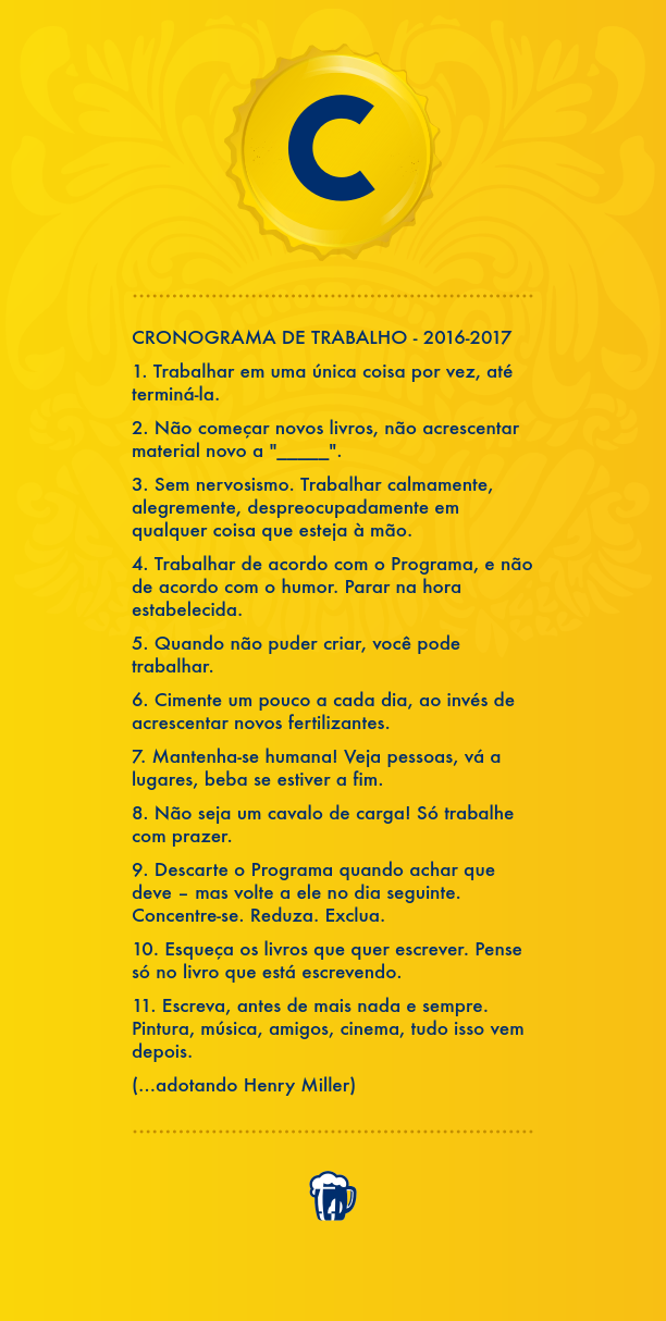 Traduzi e adaptei um pouco às minhas necessidades os onze mandamentos que Henry Miller listou para o biênio 1932-1933, quando estava escrevendo o que seria seu primeiro romance publicado, “Trópico de Câncer”. Eles vêm bem a calhar quando se está começando o terceiro ano do doutorado, em que temos que começar a resumir as explorações teórico-metodológicas para entrar de vez a campo, e escreverescreverescrever.