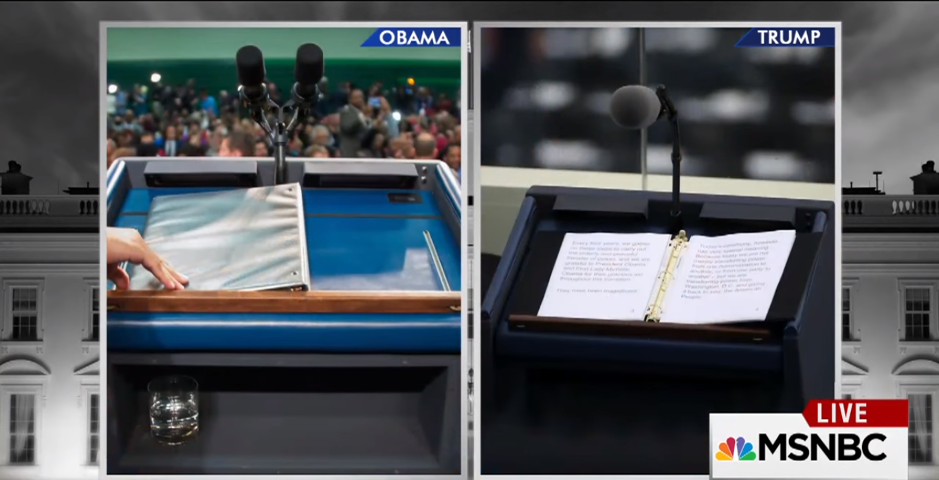 Brian Williams (apresentador) – Mais cedo na transmissão, mencionamos que Donald Trump mudou a maneira como se comunica com sua audiência, em relação a outros presidentes. Isso começou a partir do seu primeiro momento com presidente. Nosso convidado de hoje foi o primeiro a perceber a mudança e a nos alertar sobre ela ainda no dia da posse. Josh King é um assessor veterano, da época de Clinton na Casa Branca. Ele sabe como as coisas acontecem por lá e tem estado às voltas com a política e a presidência há um bom tempo. Importante dizer que Josh é autor do livro “Fora do script: Um guia para técnicas de comício, espetáculo de campanha e suicídio político” [numa tradução bem livre]. Bem, esperamos que não… E verdade seja dita: você entrou em contato comigo no dia da posse. Nós estávamos olhando para o púlpito por trás do qual o presidente ficou. (…) Que alteração você percebeu ali?