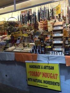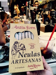 No caso das neulas, não estavam tão óbvias. Eram um dos diversos produtos expostos, e vinham dentro de uma caixinha, de maneira que talvez passassem despercebidas. Mas havia uma grande placa anunciando torró (torrone). E, na Catalúnia, onde há torrone é muito provável que haja também neules. Havia!