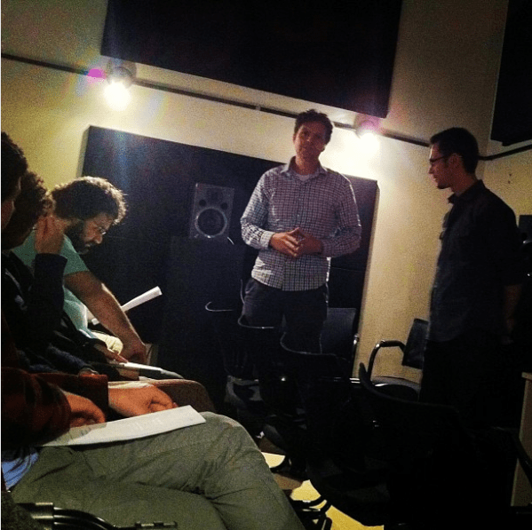 Em pé, Eloy Fritsch (ao centro) e Rafael de Oliveira, na Sala dos Sons, para o Concerto de Música Eletroacústica Brasil-Portugal em 2013 (Foto: Thaís Aragão)