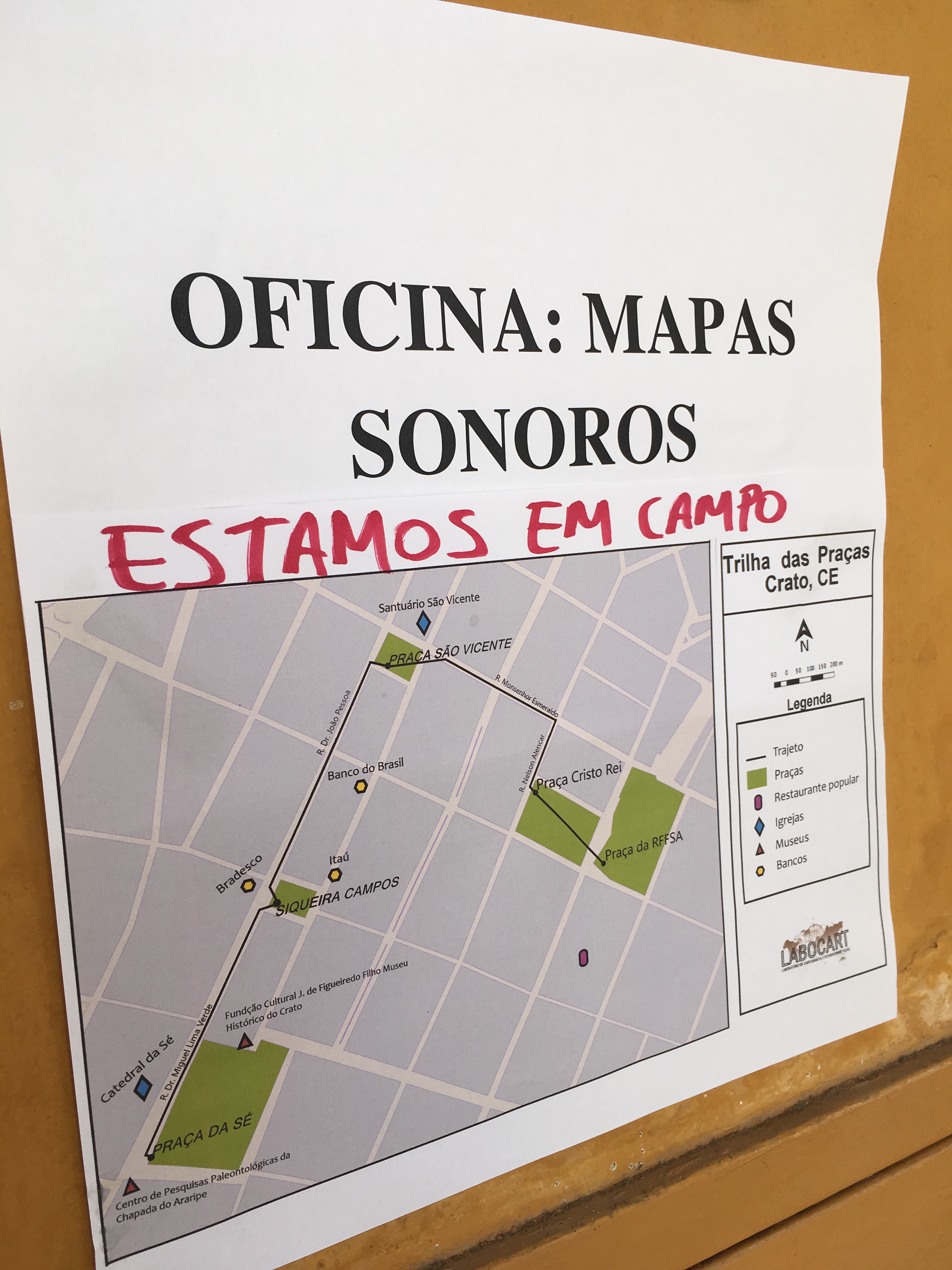 Na primeira manhã (06/11), estivemos no laboratório discutindo cartografia sonora, a partir da exposição de vários casos no Brasil e no mundo. No dia seguinte, saímos a campo, percorrendo a trilha das praças do Crato, previamente preparada pela equipe do Labocart.